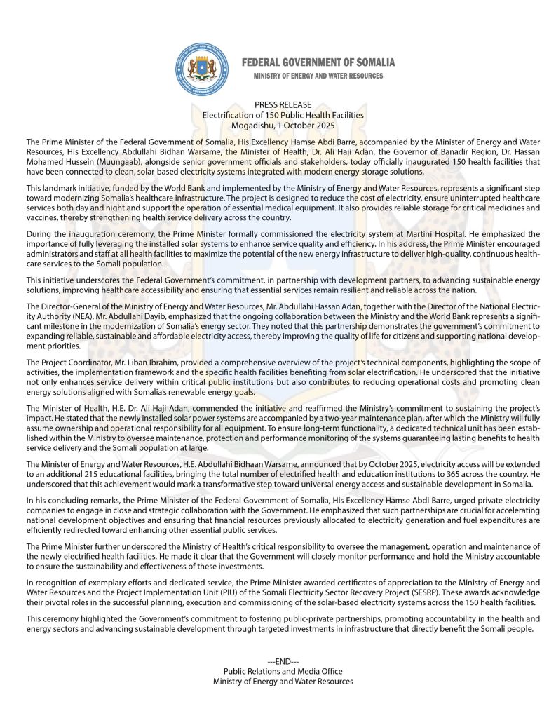Mogadishu, 1 October 2025: The Prime Minister of the Federal Government of Somalia, His Excellency Hamse Abdi Barre, accompanied by the Minister of Energy and Water Resources, His Excellency Abdullahi Bidhan Warsame, the Minister of Health, Dr. Ali Haji Adan, the Governor of Banadir Region, Dr. Hassan Mohamed Hussein (Muungaab), alongside senior government officials and stakeholders, today officially inaugurated 150 health facilities that have been connected to clean, solar-based electricity systems integrated with modern energy storage solutions.